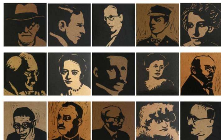 installation view of Freud's Dream Circle at The Freud Museum, London. Installation consists of 16 boxes 12.5 x 12.5 x 12.5cms; each facet of a box is printed with the image of one of Freud's associates or colleagues